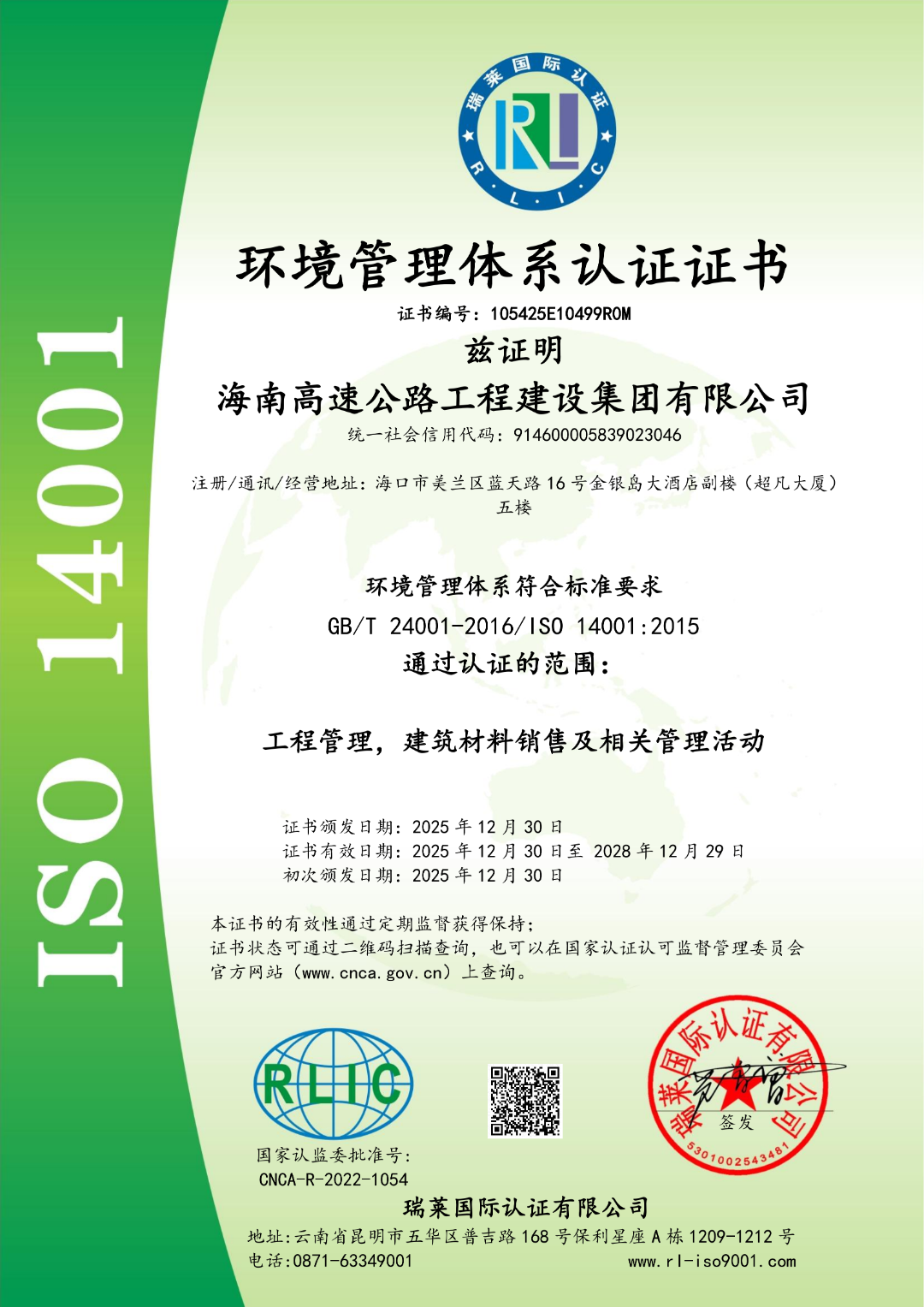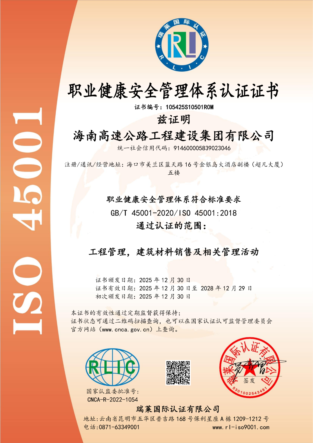 此次认证圆满完成,标志着海南高速公路工程建设集团有限公司正以更加规范、稳健、负责的姿态,迎接新发展机遇,助力区域经济社会持续进步。