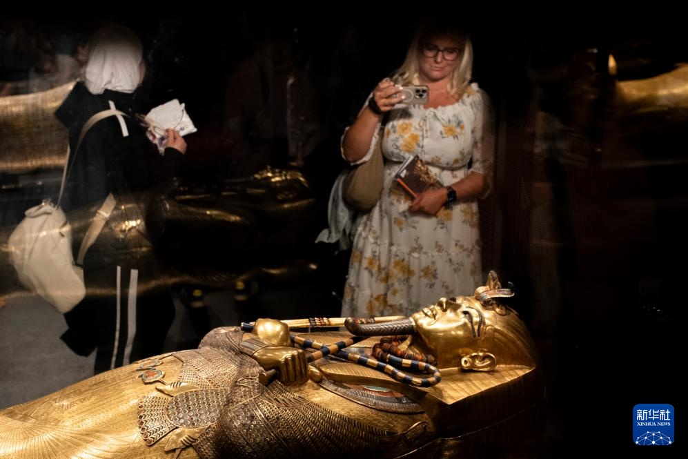 12月20日,游客在埃及吉萨的大埃及博物馆观赏法老图坦卡蒙的黄金内棺。新华社记者 辛梦晨 摄