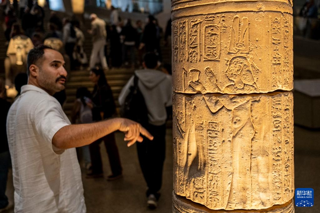 12月20日,游客在埃及吉萨的大埃及博物馆观赏纪念国王托勒密九世的石柱。新华社记者 辛梦晨 摄