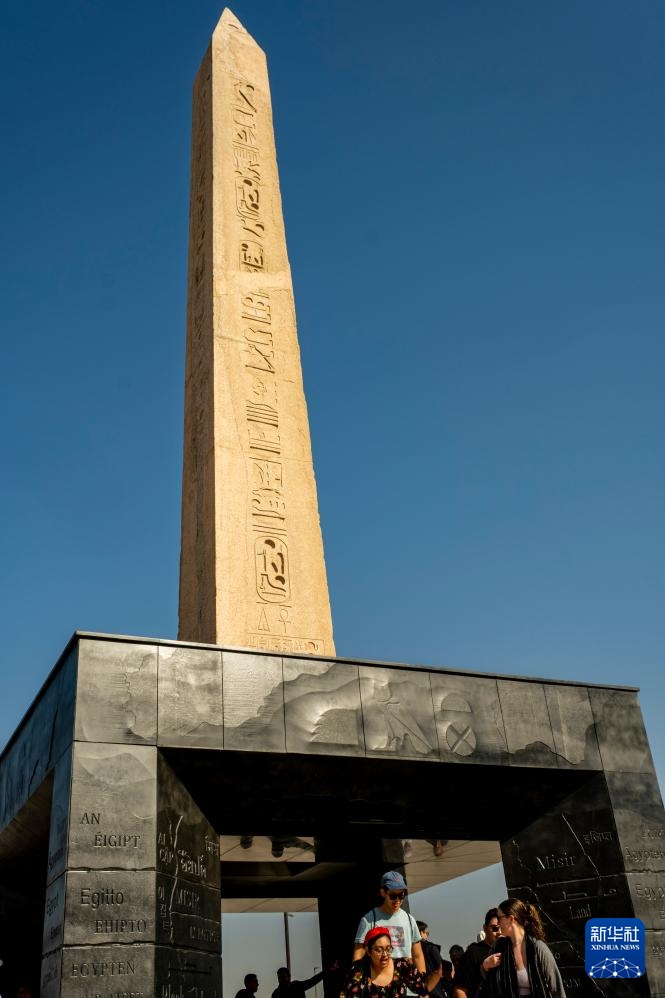 12月20日,游客在埃及吉萨的大埃及博物馆观赏法老拉美西斯二世的方尖碑。新华社记者 辛梦晨 摄